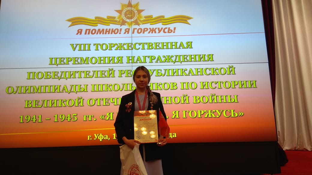 В Доме Государственного Собрания – Курултая Республики Башкортостан состоялось награждение победителей и призеров Республиканской олимпиады по истории Великой Отечественной войны 1941–1945 годов «Я помню. Я горжусь». Награды 35 школьникам и их наставникам вручил Председатель парламента республики Константин Толкачев. Поздравить победителей также пришли министр молодежной политики и спорта РБ Руслан Хабибов, заместитель министра образования и науки РБ Ильдар Мавлетбердин. Вэтом году в олимпиаде участвовало уже свыше 125 тысяч учащихся 2–11 классов из 59 городов и районов. Более 12 тысяч ребят стали победителями школьного этапа олимпиады, 670 школьников вышли на республиканский этап, заняв призовые места на муниципальном уровне. Именно массовость – основная цель проекта, поскольку благодаря участию в олимпиаде можно улучшить свои знания об историческом периоде, связанном с Великой Отечественной войной.